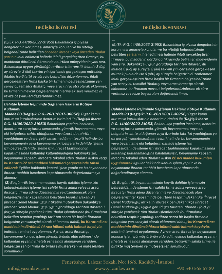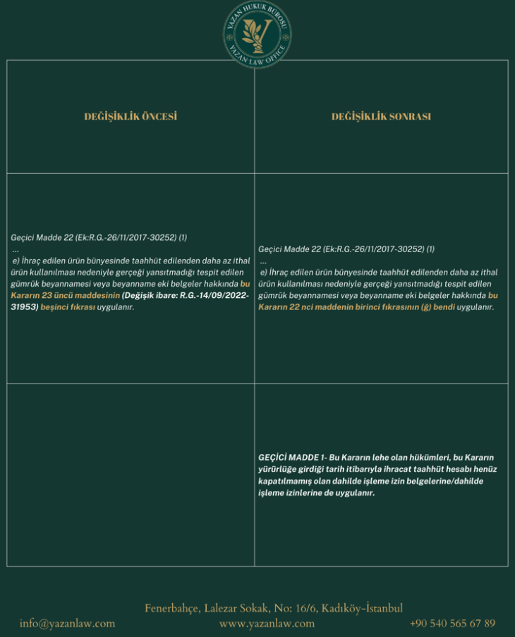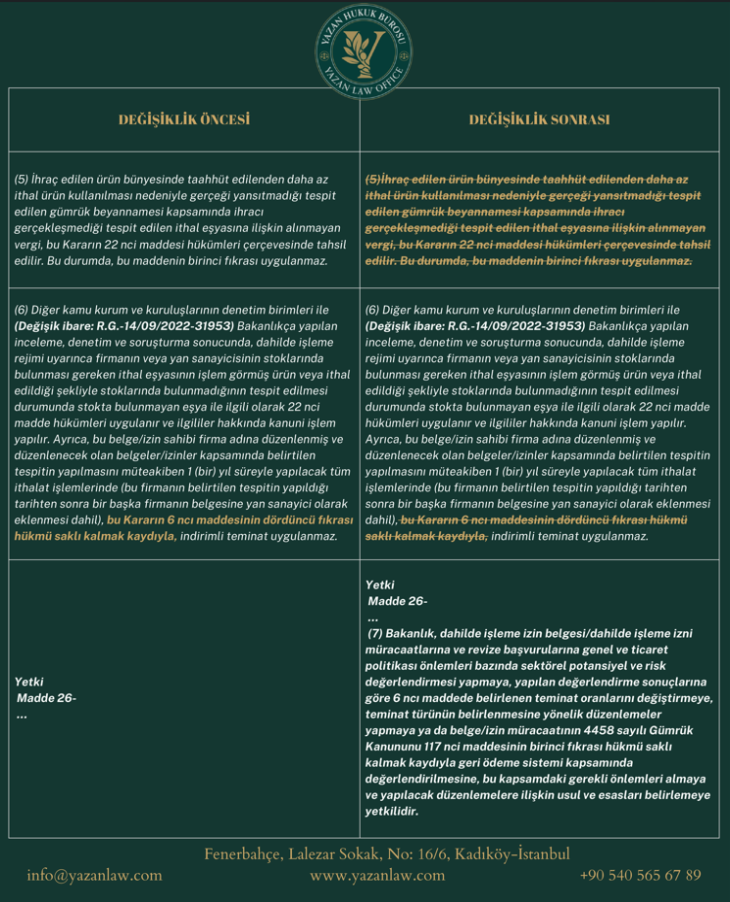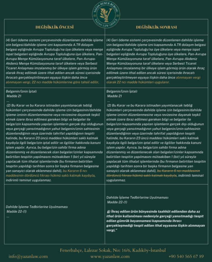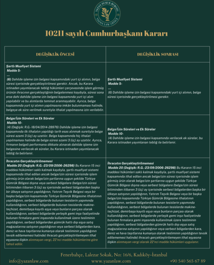 16 Ağustos 2025 tarihinde 32988 sayılı Resmî Gazetede yayımlanan 10211 sayılı Cumhurbaşkanı Kararı ile 17/1/2005 tarihli ve 2005/8391 sayılı Bakanlar Kurulu Kararı ile yürürlüğe konulan Dahilde İşleme Rejimi Kararının “Dahilde İşleme Rejimi Kararında Değişiklik Yapılması Hakkında Karar” ile aşağıda konuya ilişkin karşılaştırmalı değerlendirmelerimizde sunduğumuz şekilde değişiklikler yapılmasına karar verilmiştir.